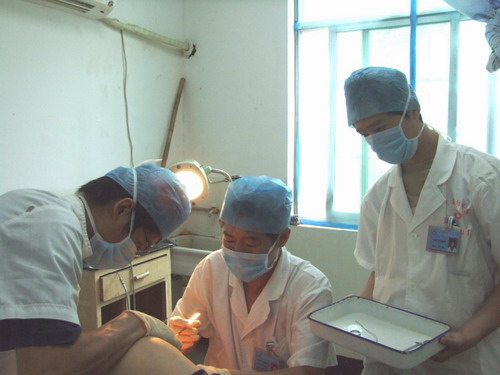 图2为:由韩春利主刀,用独创的微创手术法给患者实施痔瘘手术。