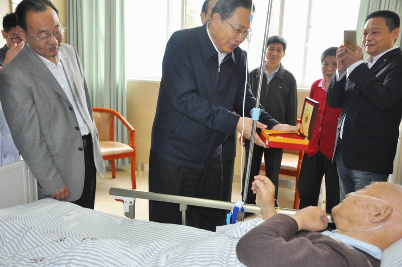在红军长征胜利80周年之际,1019日上午,安徽省委书记李锦斌走进安徽医科大学第一附属医院,看望慰问正在住院的农垦老红军刘耀东,现场颁发长征胜利纪念章和发放一次性生活补助,并向他致以崇高敬意和诚挚问候。省委常委、省委秘书长唐承沛,省委副秘书长、办公厅主任闵光辉,省委保健委专职副主任沈干,省委老干部局巡视员邱茂叶,省农垦集团党委书记、董事长李卓民陪同慰问。