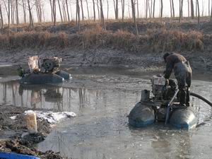 说明:潘村湖农场冬修战役于日前拉开序幕。为提 高农业抗灾减灾能力,增强农业发展后劲,潘村湖 农场认真贯彻落实集团公司水利会议精神,因地制 宜做好冬季水利兴修工作,确保各项工程按期按质 完成。图为大型吸浆机在苏义干沟施行清淤作业。 (杨登宏摄)
